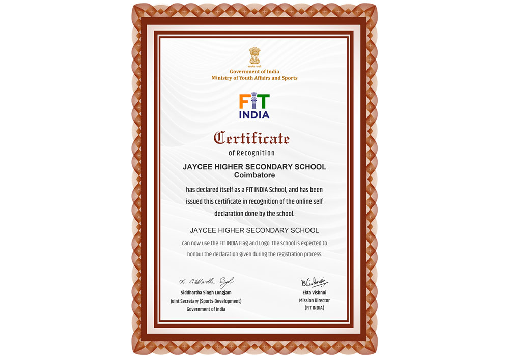 FIT INDIA SCHOOL, Certificate of recognition
